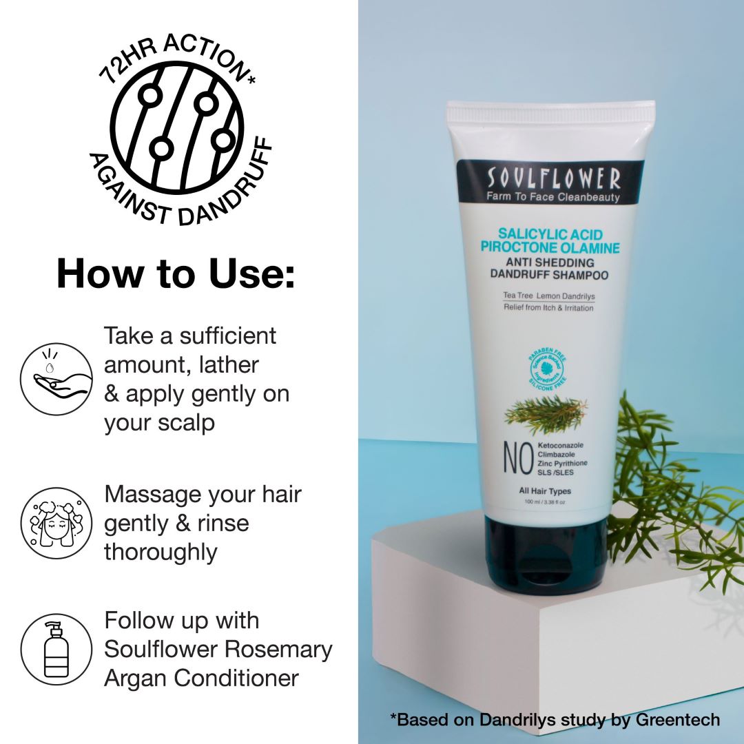 • Treat: Soulflower Anti-dandruff Serum. It’s a T2P2 Technology for dandruff control, gives shiny, smooth hair, hair loss control, & frizz control. Piroctone Olamine in the serum is clinically proven to give a visible reduction in dandruff from the 8th day onwards. (Based on Piroctone Olamine Study by Arxada)