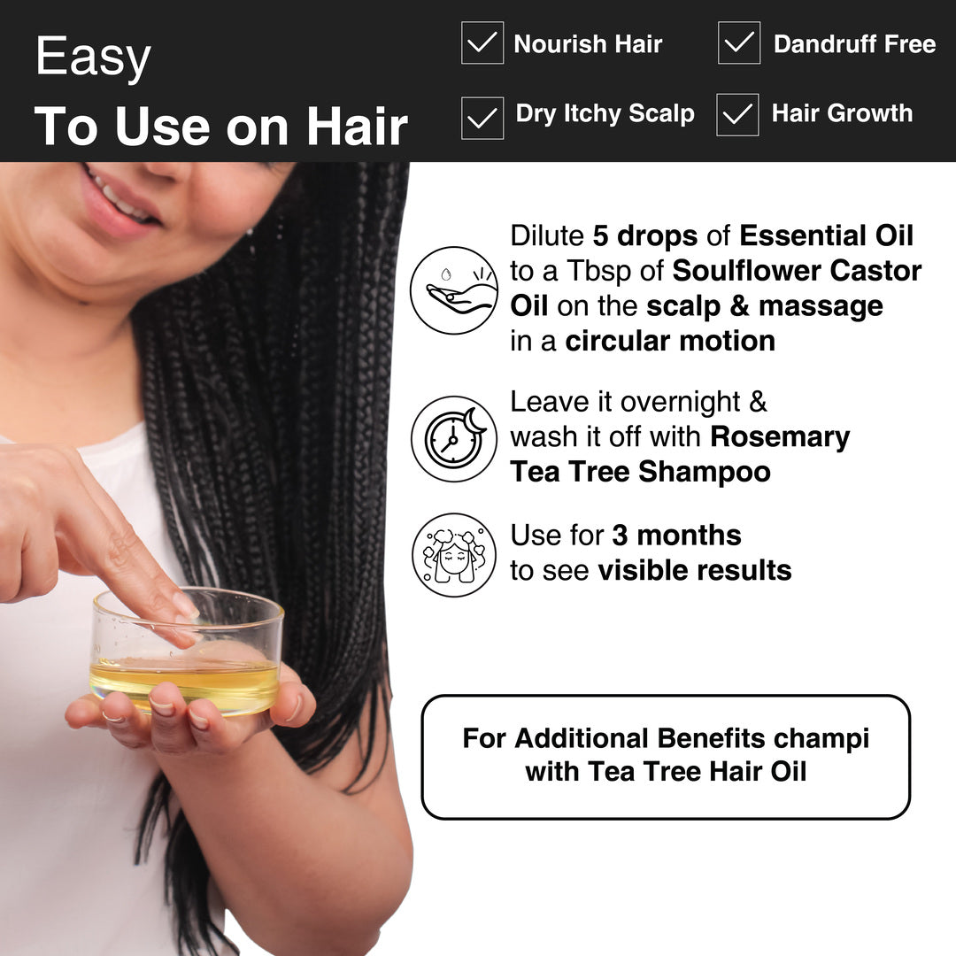 1. Apply 5 drops of Tea Tree Essential Oil with 1-2 tbsp Tea Tree Scalp Oil.