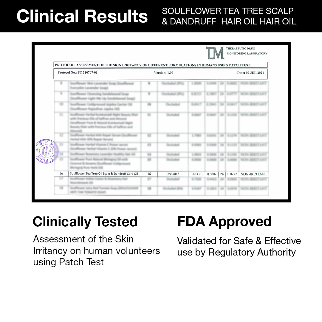- Condition + Nourish: Soulflower Tea Tree Scalp Oil + Tea Tree Essential Oil to clear flakes & dandruff, remove excess scalp sebum, prevent dryness & give required nourishment to hair. This also helps prevent hair from further breakage while strengthening the hair shaft. USFDA Approved, ESG Certified,Vegan, Preservative-free with no additives.