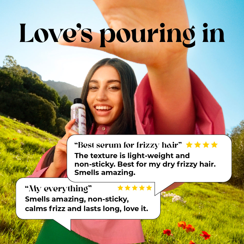 The hair serum tames fly-offs and adds a gorgeous shine to lifeless, dull hair. It is super easy to use and comes in a recycled plastic bottle. Our caps and pumps aren’t made from recycled plastics yet, but we’re working on it. We like to extend our love for the planet and your hair by eliminating nasties like parabens, dyes and sulfates from the hair serum. Our goal is a carbon footprint so small, it’s like we weren’t even here.