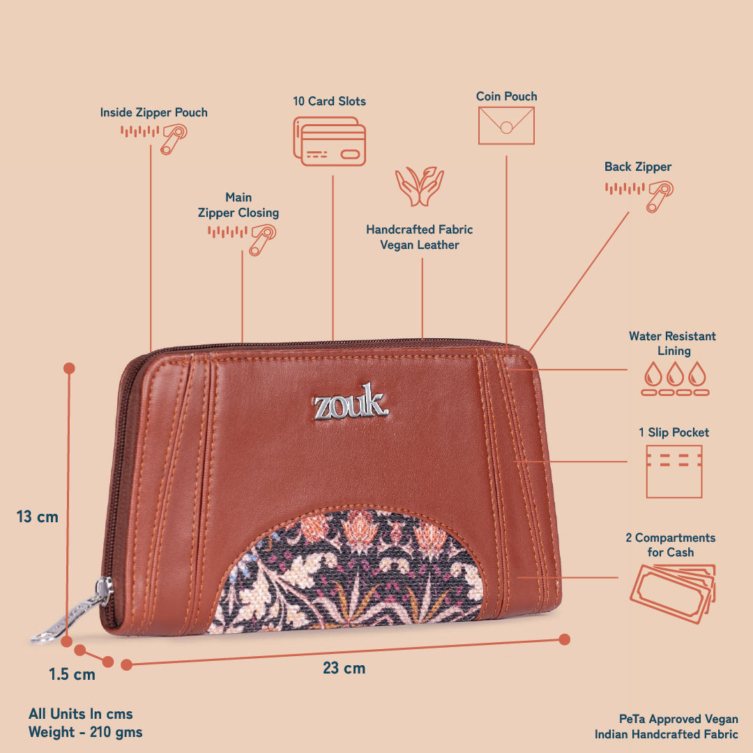 It offers 10 card slots and a slip pocket for keeping all of your cards & bills neatly organized. It comes with a coin pouch to conveniently store your loose change and a zipper pouch for guarding your small essentials. The wallet also includes 2 cash slots to keep your notes neatly organized. Additionally, a quick access zipper pocket conveniently stores frequently used items like keys or receipts while you are on-the-move.