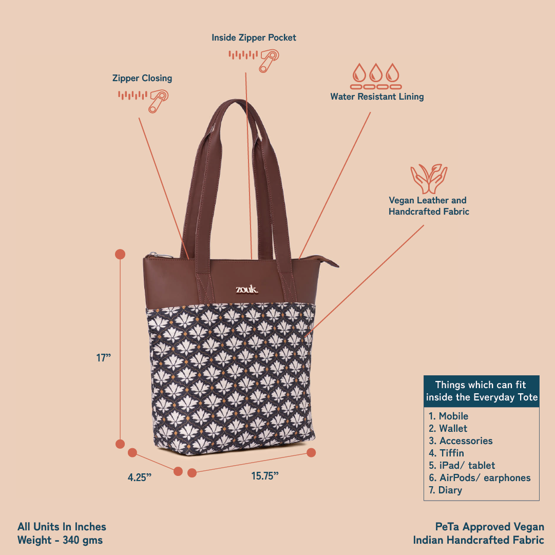 This is a Proudly Indian and 100% PeTA approved Everyday Tote Bag, A blend of thoughtful functionality and minimal design, this tote is made to secure and streamline your essentials in your everyday endeavors. It offers plenty of room to store your daily essentials. Crafted with printed jute khadi and vegan leather, this durable tote which will complement your outfits and will offer effortless carry.