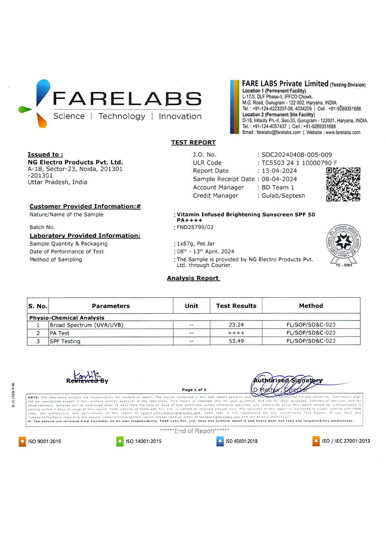 Our Vitamin Infused Brightening Sunscreen SPF 50 PA++++ provides a broad spectrum UVA & UVB rays and blue light protection. With antioxidant-rich ingredients, it promotes glowing & brighter skin by reducing dark spots, pigmentation, and photodamage. So, this sunscreen Protects & Brightens Skin with every use!
