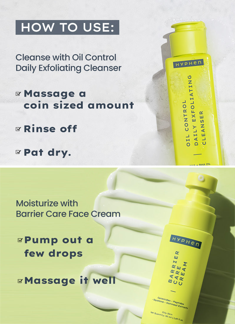 CLEANSE – MOISTURIZECleanse – Oil Control Daily Exfoliating Cleanser removes excess oil, controls sebum and unclog pores by removing makeup, dirt, dead skin cells and impurities.Moisturize – Barrier Face Care Cream – Oily to Combination Skin strengthens skin barrier and deeply hydrates the skin without clogging pores.