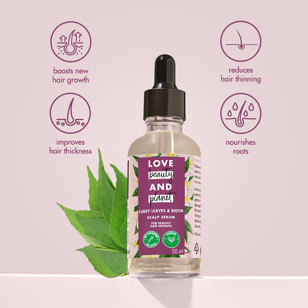 PLANT EXTRACTS Love Beauty & Planet’s Healthy Hair Growth Scalp Serum is made with curry leaves & vegan biotin. LIGHTWEIGHT This scalp serum has a lightweight, non-sticky texture & is best to be used at bedtime & left overnight.