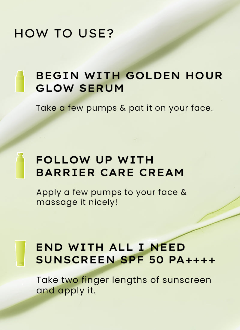 A skincare routine, carefully tailored for those with normal to dry skin, to offer both hydration and deliver real results. It includes Golden Hour Glow Face Serum, Barrier Care Face Cream for normal to dry skin and All I Need Sunscreen spf 50 pa++++.