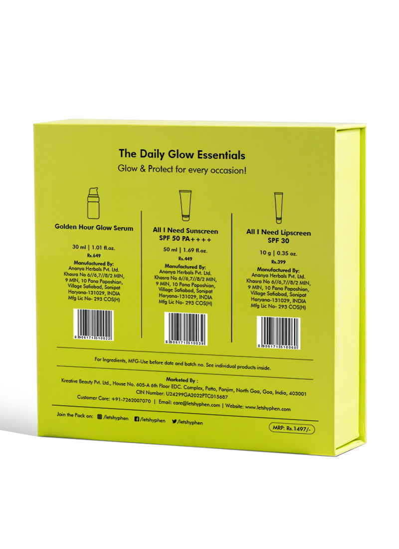 The Daily Glow Essentials Gift Kit is a carefully curated collection of everyday essentials designed as a thoughtful gift to unlock a radiant glow. It includes the Golden Hour Glow Serum, All I Need Sunscreen SPF 50 PA++++, and All I Need Lipscreen SPF 30.