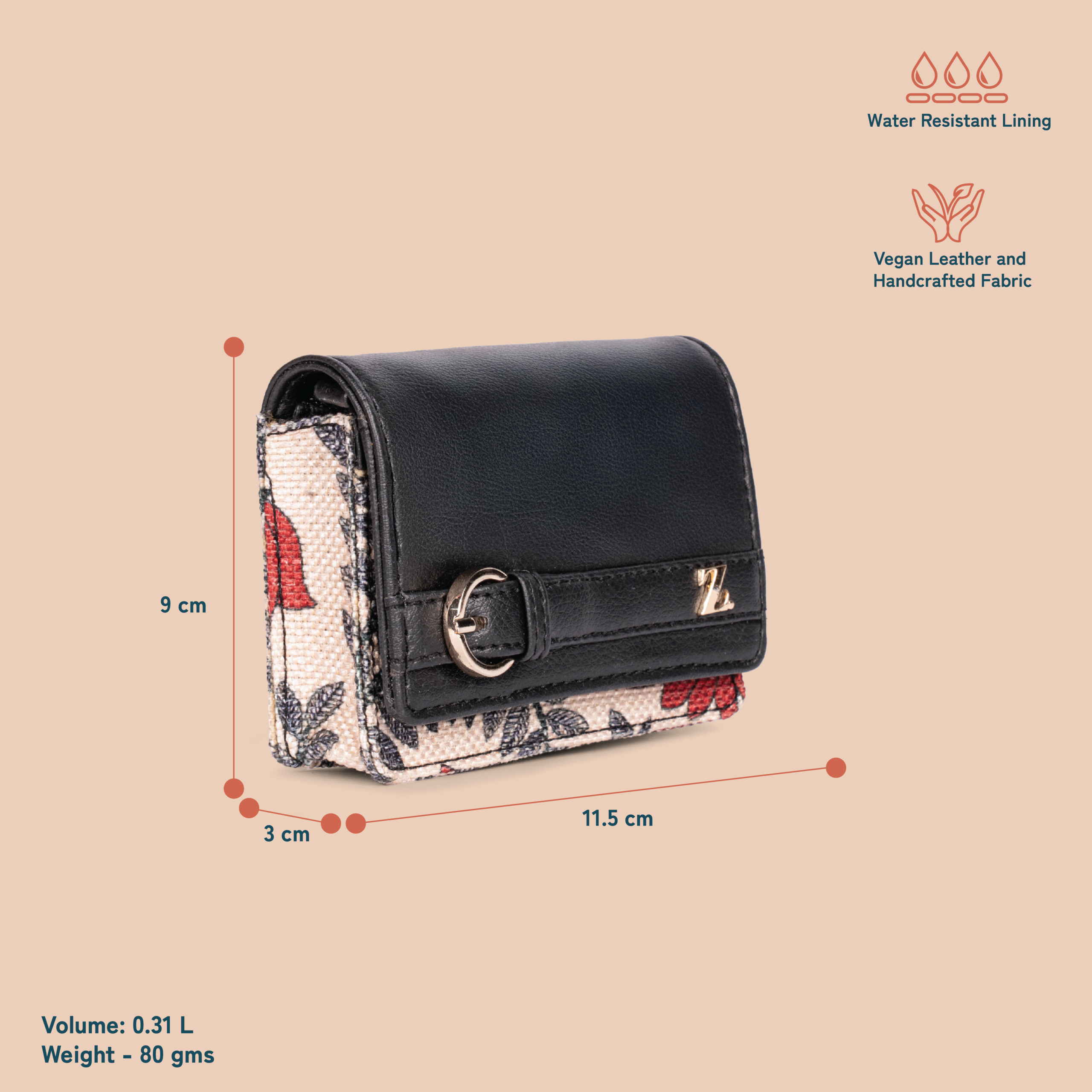 Materials: Vegan leather, handicraft fabric, nickel fittings