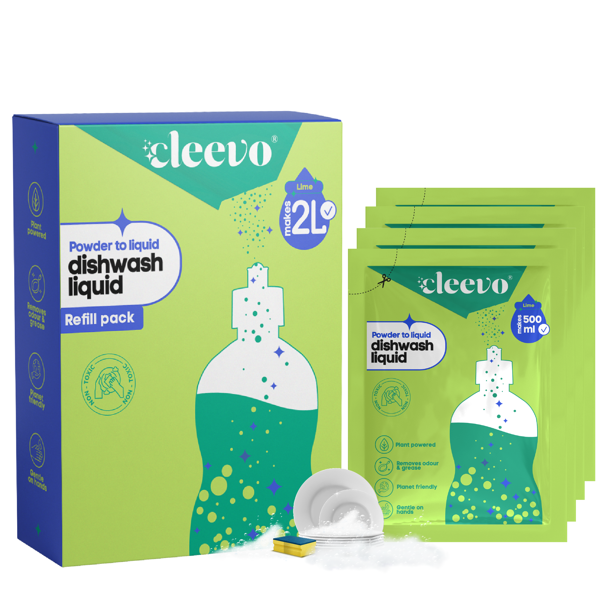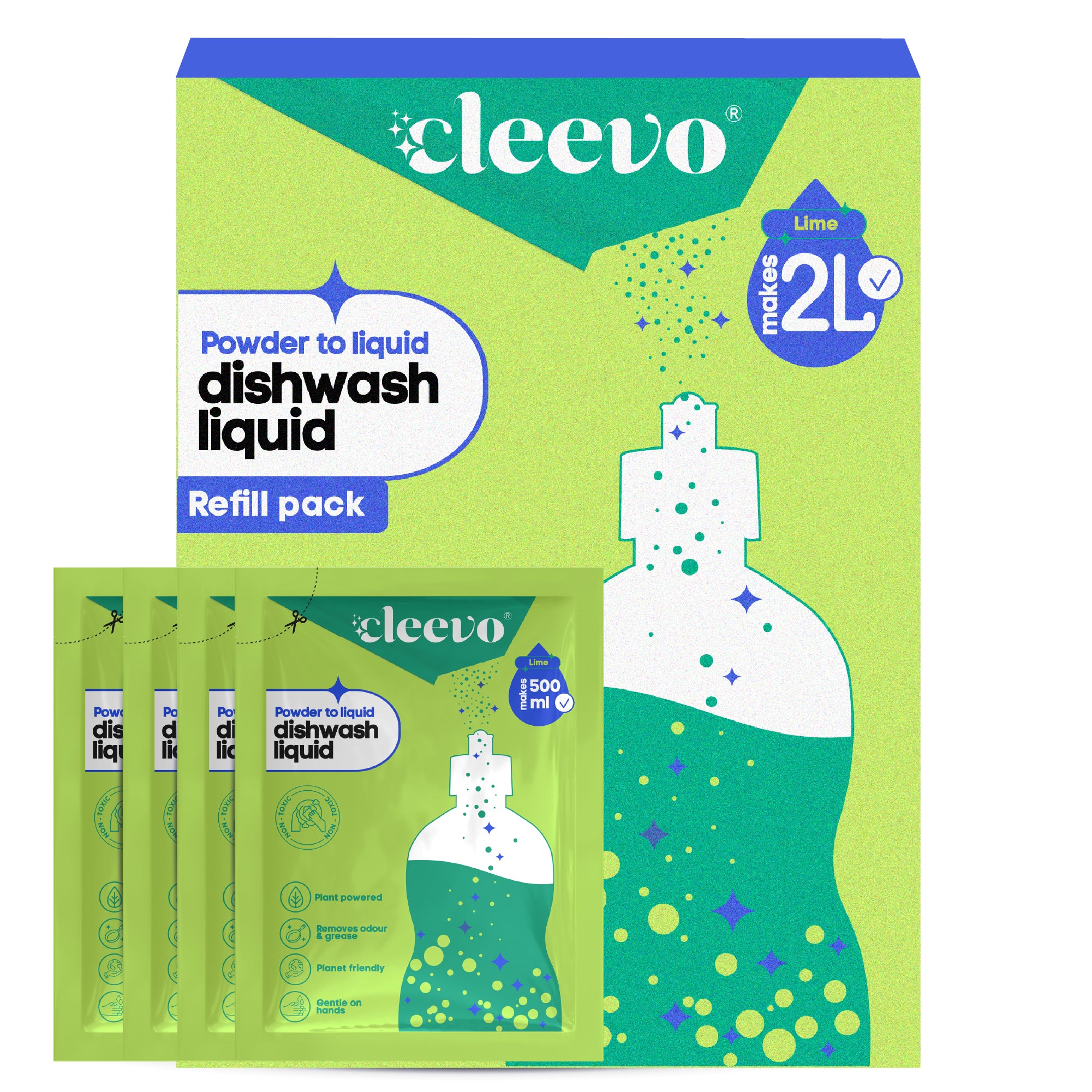 With each pouch, you can make 500 ml of zesty lime-scented dishwash liquid that will leave your dishes smelling fresh. Simply mix with water, shake it up with any 500 ml pump bottle you have lying around, or opt for our stylish Cleevo bottle that you can reuse indefinitely.