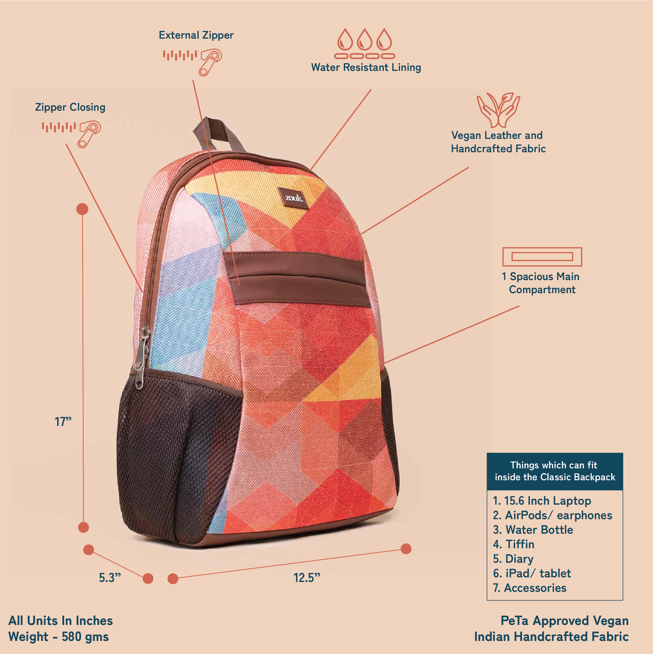 Material Used – Vegan Leather, Handicraft Fabric, Water-resistant inner lining, premium accessories .