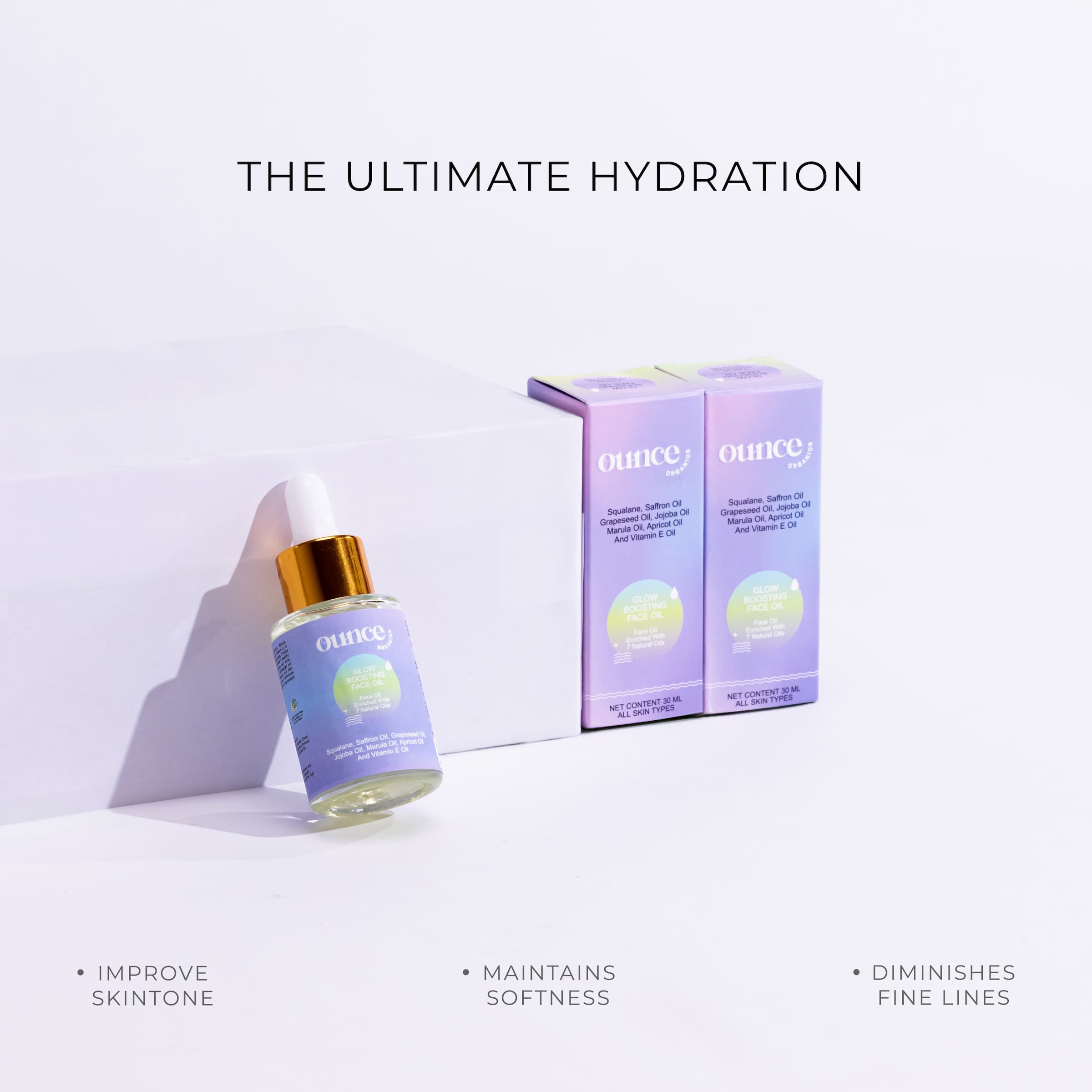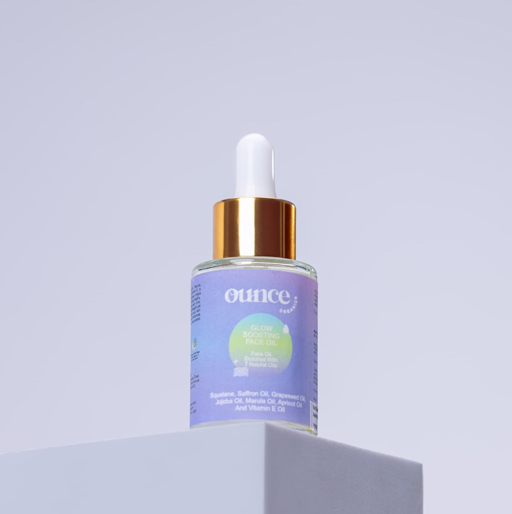 Unlock luminous, youthful skin with Ounce Organics Glow Boosting Face Oil—a luxurious blend of Squalene, Saffron Oil, Grapeseed Oil, Jojoba Oil, Marula Oil, Apricot Oil, and Vitamin E. This fast-absorbing, non-greasy formula deeply hydrates, restores moisture balance, and nourishes the skin while brightening and evening tone. Rich in antioxidants and skin-replenishing nutrients, it softens, protects against free radicals, and leaves every skin type with a radiant, glowing complexion.