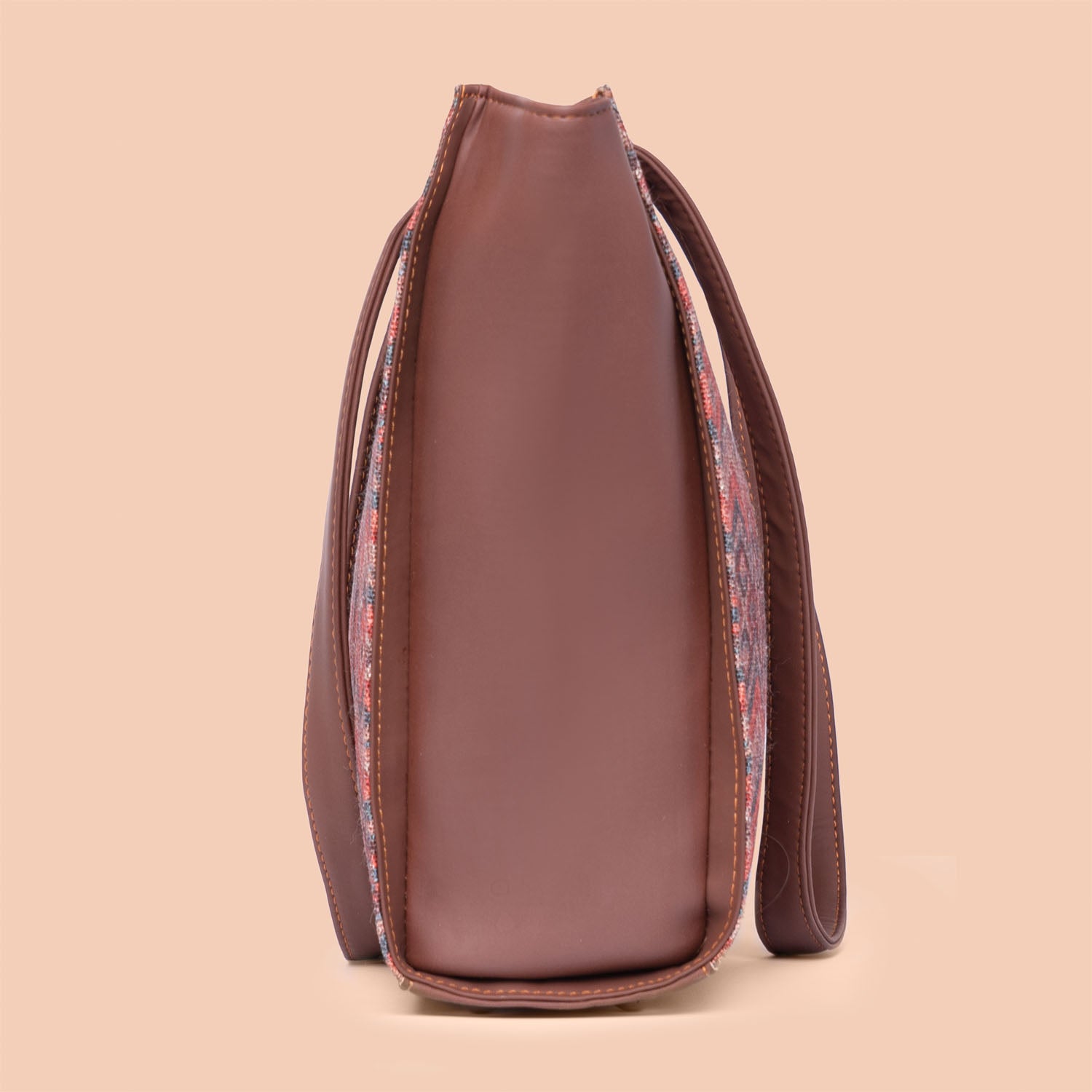 Material Used – Vegan Leather, Handicraft Fabric, Water-resistant inner lining, matte metal fittings.