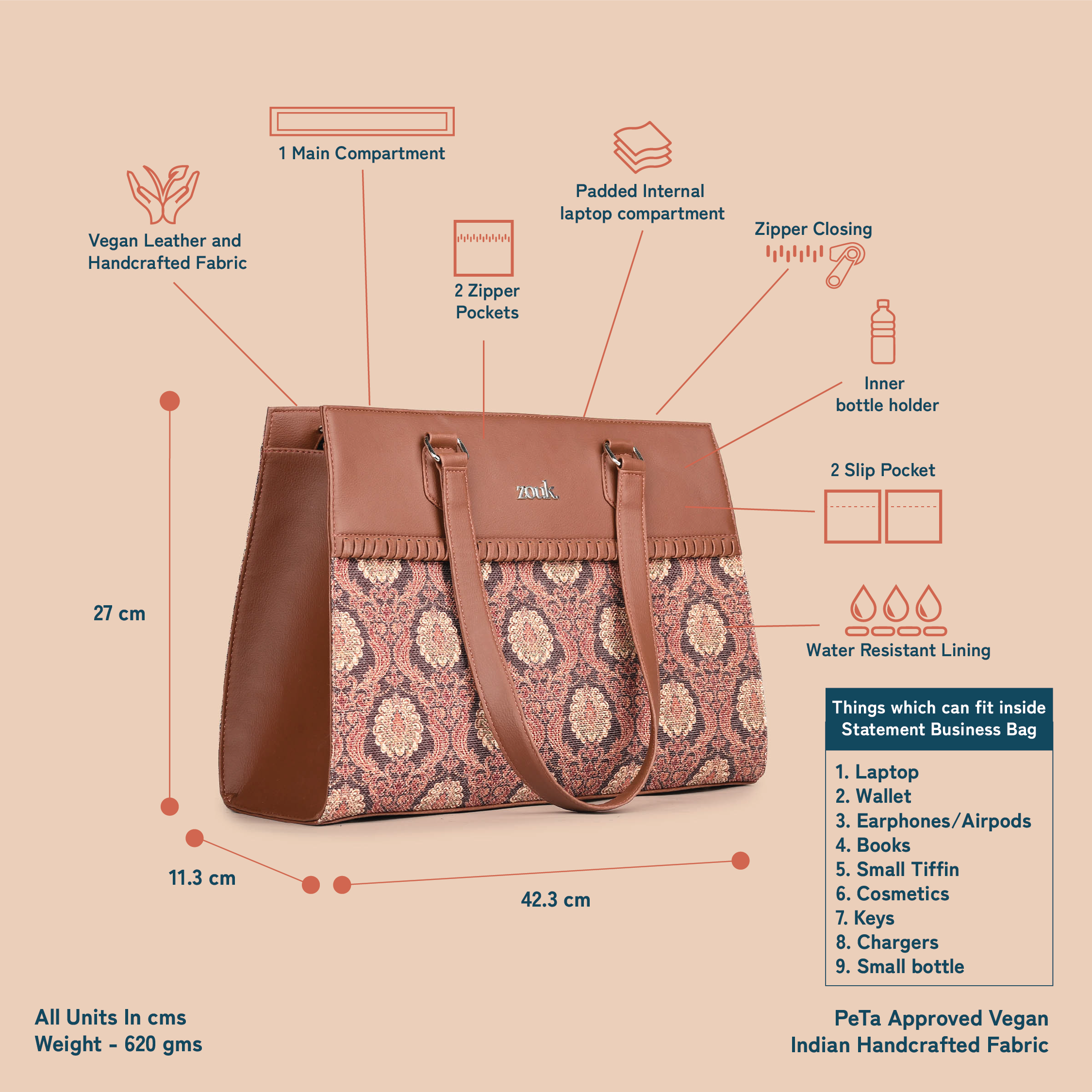 Material Used – Vegan Leather, Handicraft Fabric, Water-resistant inner lining, Premium accessories