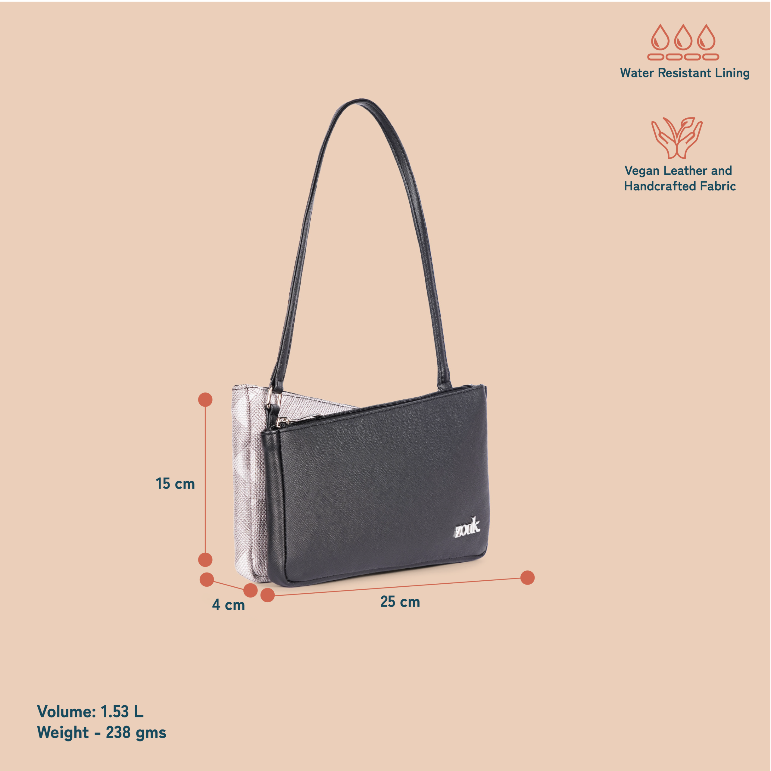 When it comes to versatility, the Kiya Baguette tops the charts. Featuring a stunning two-tone, criss-cross design, this PETA-approved baguette comes with vegan leather panelling on one side and a proudly Indian fabric print on the other.