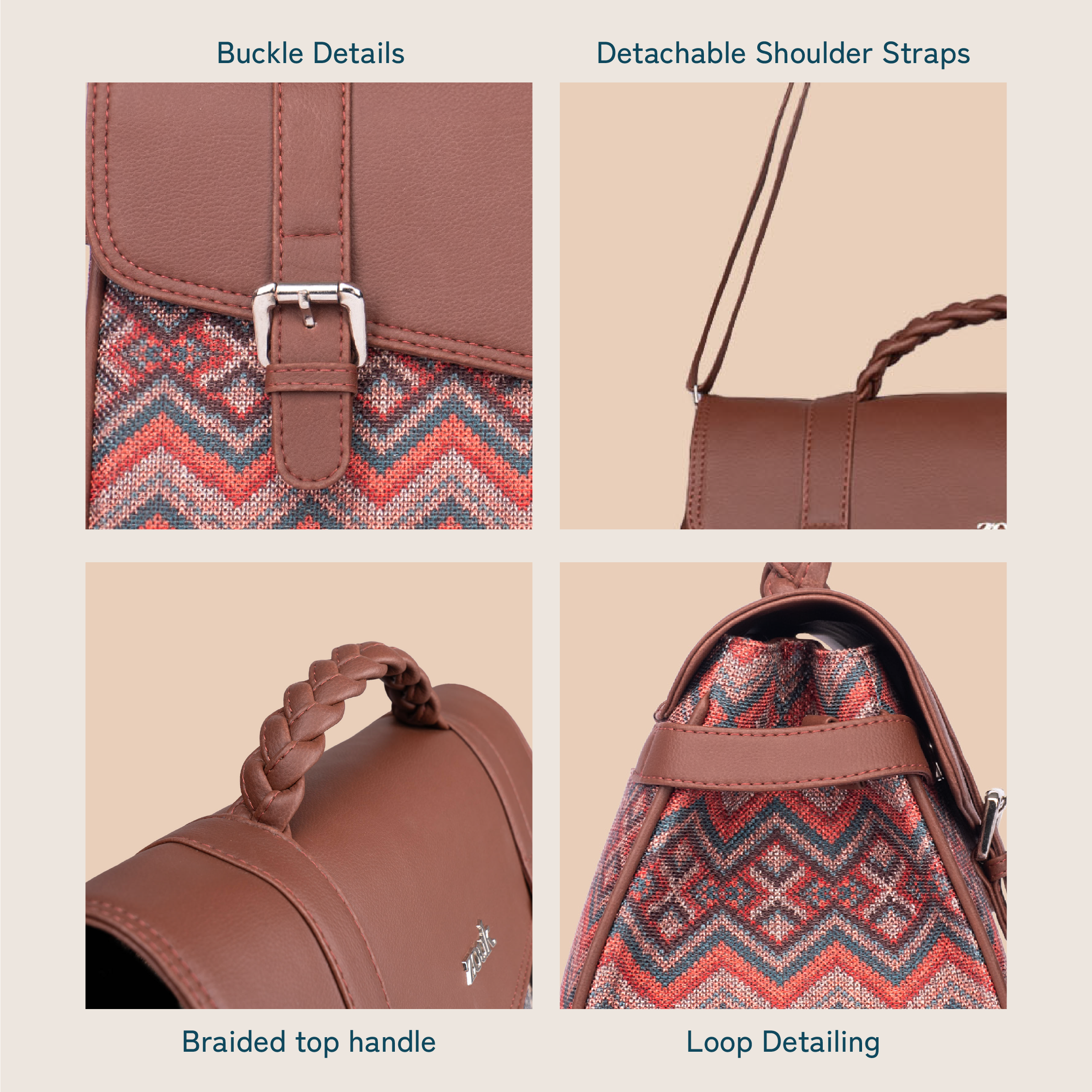 Material Used – Vegan Leather, Handicraft Fabric, Nickel fittings