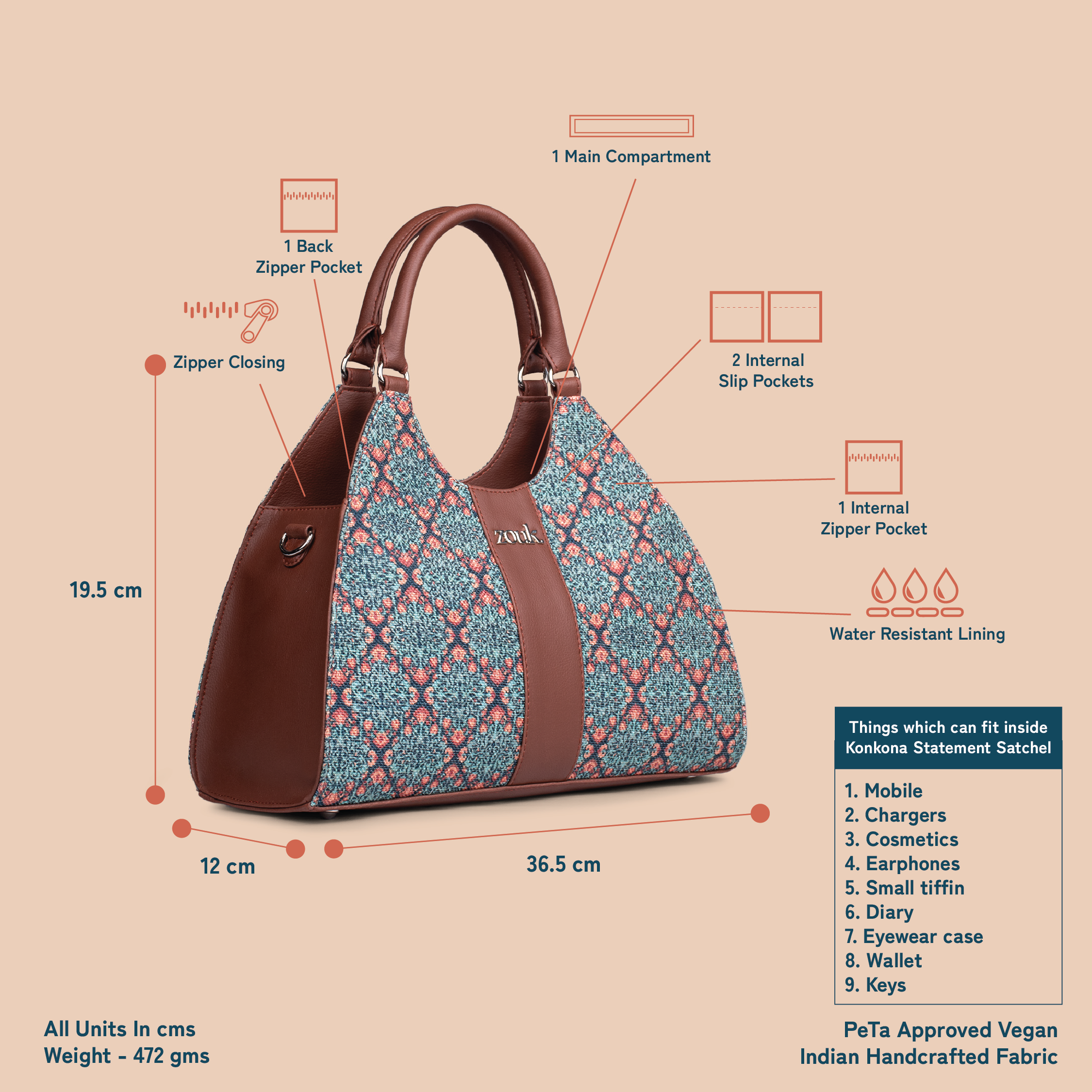 Introducing the KonKona Statement Satchel -a proudly Indian and 100% Peta Approved bag, crafted to make a striking impression. Designed with attention to both form and function,this satchel offers a new addition to your ensemble. The curved top gives an interesting shape to the bag while making it a comfortable carry. The Konkona Statement Satchel Bag is an ideal accessory, perfectly balancing fashion and practicality to make a statement.