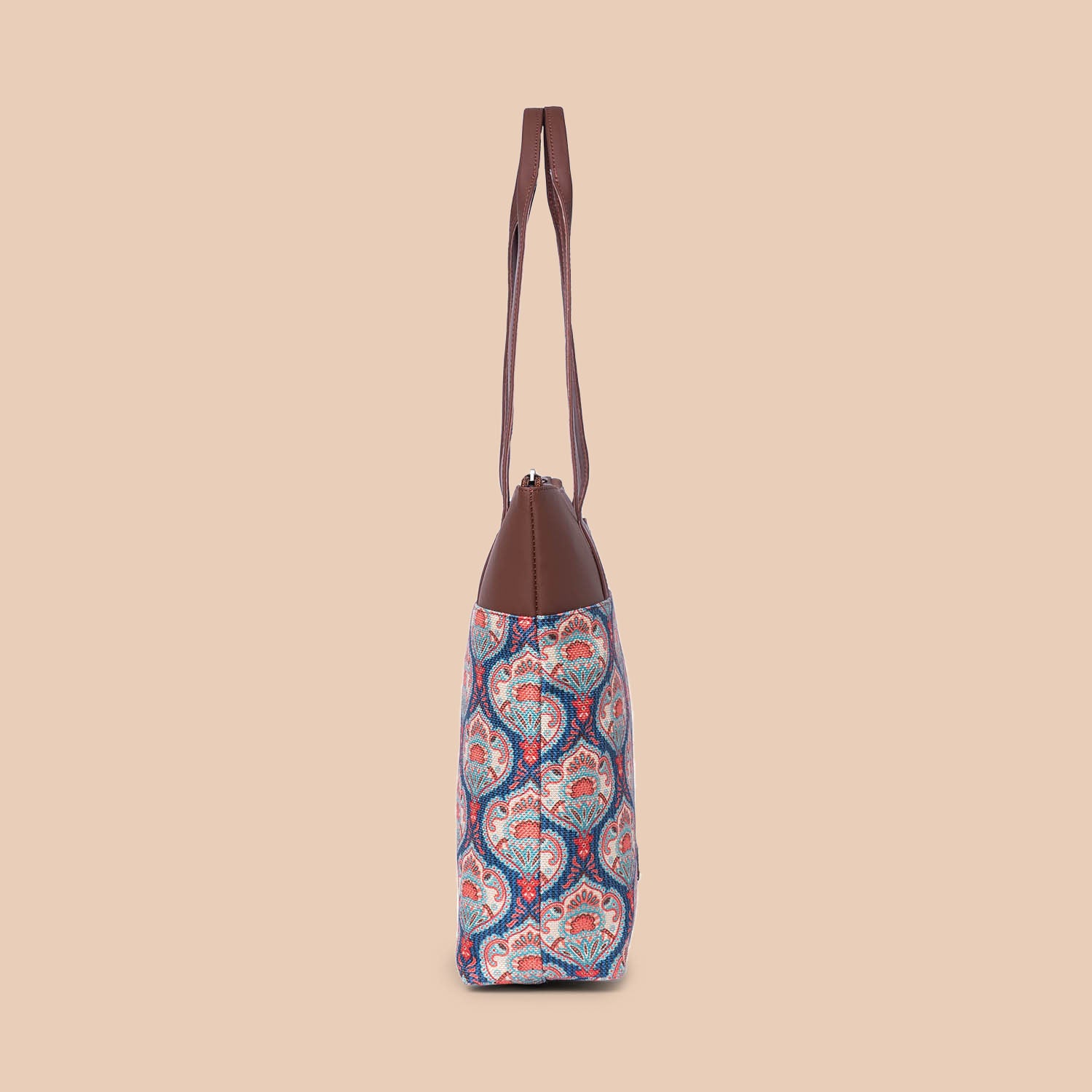 This is a Proudly Indian and 100% PeTA approved Everyday Tote Bag, A blend of thoughtful functionality and minimal design, this tote is made to secure and streamline your essentials in your everyday endeavors. It offers plenty of room to store your daily essentials. Crafted with printed jute khadi and vegan leather, this durable tote which will complement your outfits and will offer effortless carry.