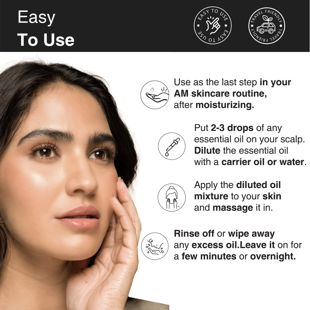 Cleanse and dry the face Take out 2-3 drops of Kumkumadi Oil on palm Gently spread it on your face evenly with an outward motion Use daily before bedtime Recommended for dry, normal, oily, and sensitive skin types.