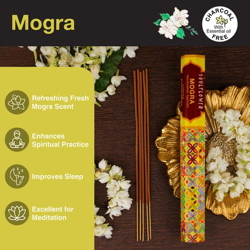 - Mogra, also known as Jasmine, with its fresh, floral & spicy notes is associated with purity, love, devotion & beauty. This intoxicating fragrance helps in promoting spiritual well-being and concentration. It just makes your puja ritual more holistic.