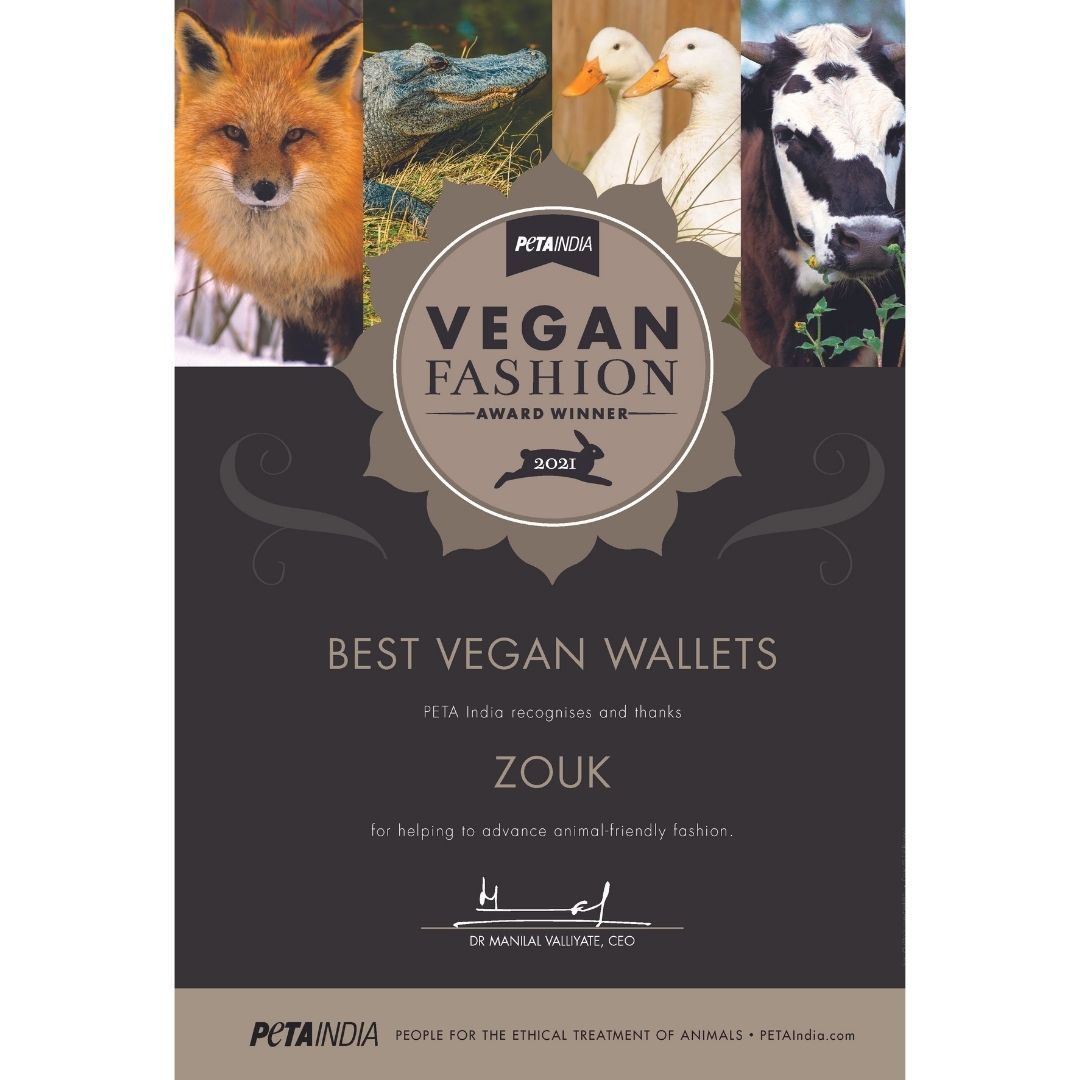 Zouk won the PeTA Best Vegan Wallets Award in the PeTA India Vegan Fashion Awards.