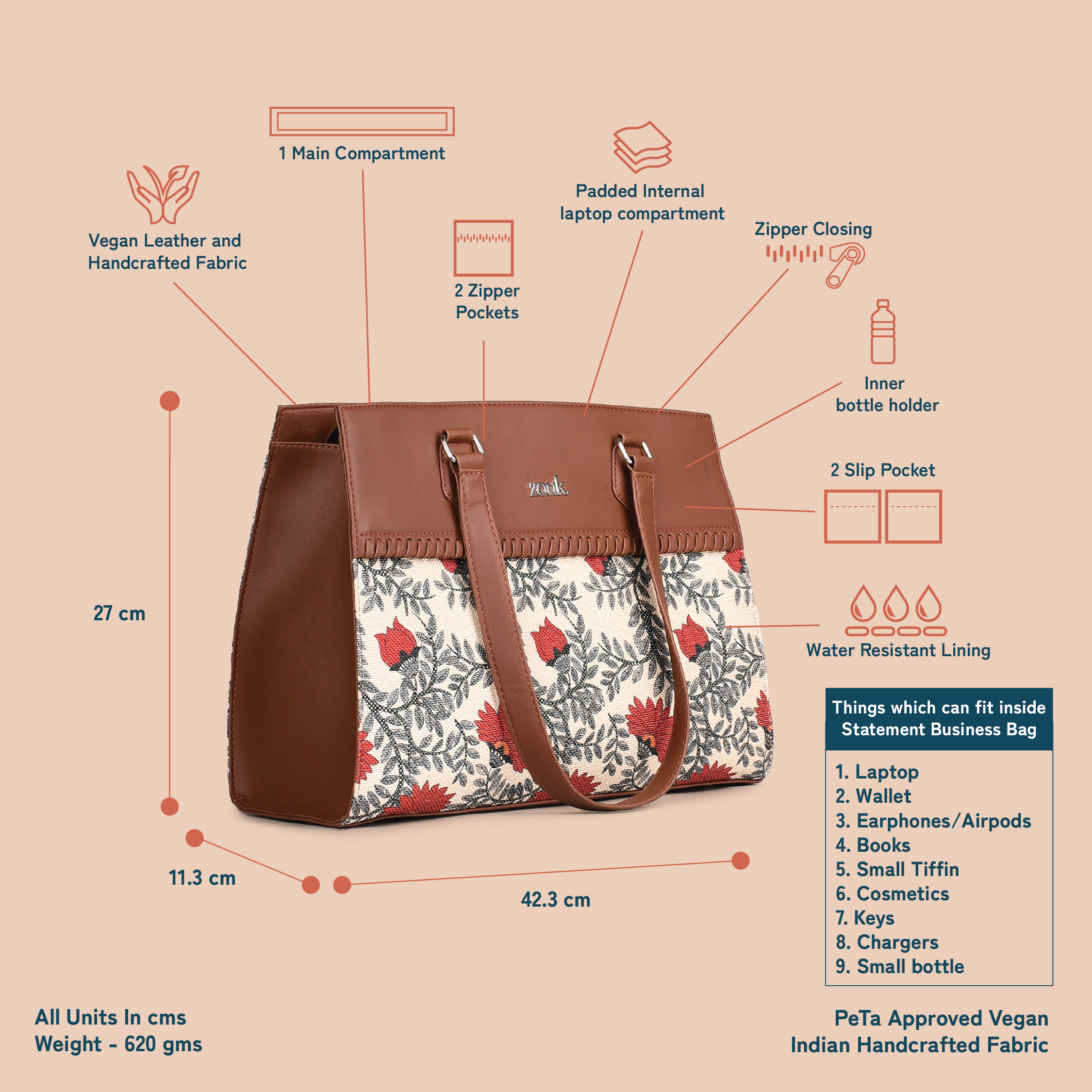 Material Used – Vegan Leather, Handicraft Fabric, Water-resistant inner lining, Premium accessories