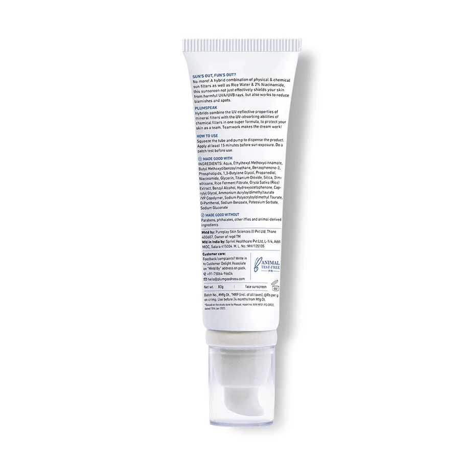 Experience advanced sun protection and skin brightening with this vegan, cruelty-free sunscreen from Plum. Formulated with 2% Niacinamide to even skin tone, reduce dark spots and sebum production, and Rice Water extract to deeply hydrate, smooth skin texture and enhance radiance. The SPF 50 PA++++ rating offers powerful broad-spectrum defense against harmful UVA & UVB rays, preventing sunburn, photo-aging and tan. Its lightweight hybrid formula blends quickly without leaving a greasy feel or white cast — perfect for all skin types and daily wear.