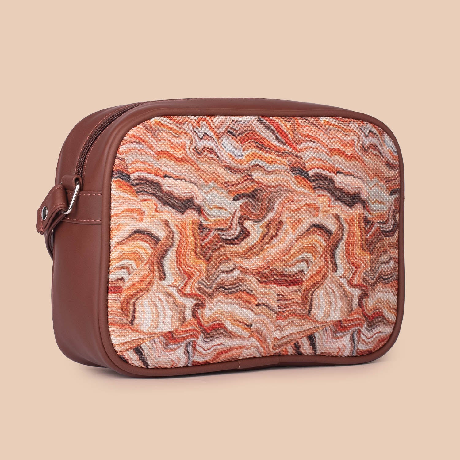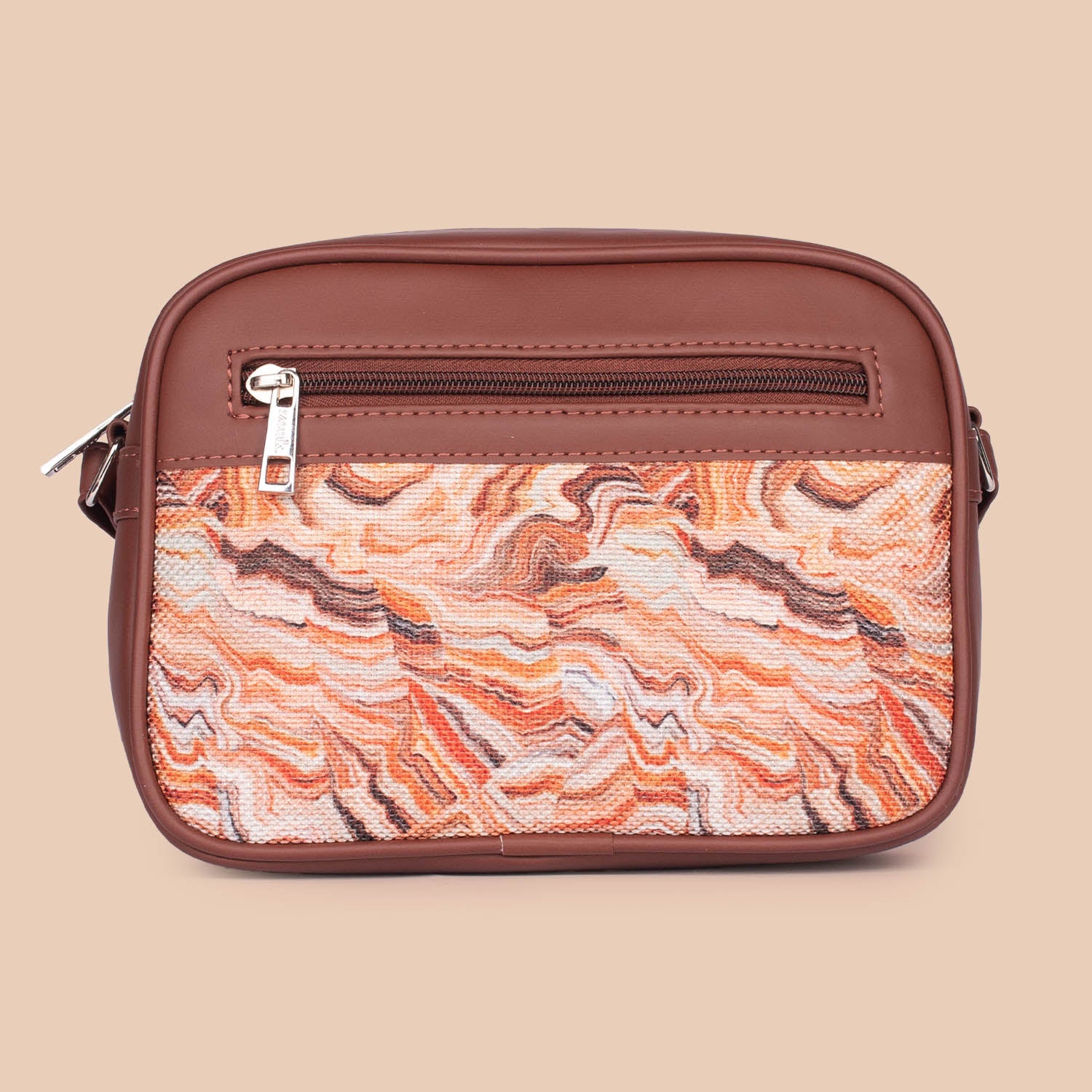 This is a Proudly Indian and 100% PeTA approved Vegan product with a Stylish Abstract Pattern. It has sturdy and durable accessories, with a zip closure and single shoulder strap handle (adjustable). The bag contains a single compartment. It has an inside zipper compartment. Also it has a back chain for quick access.