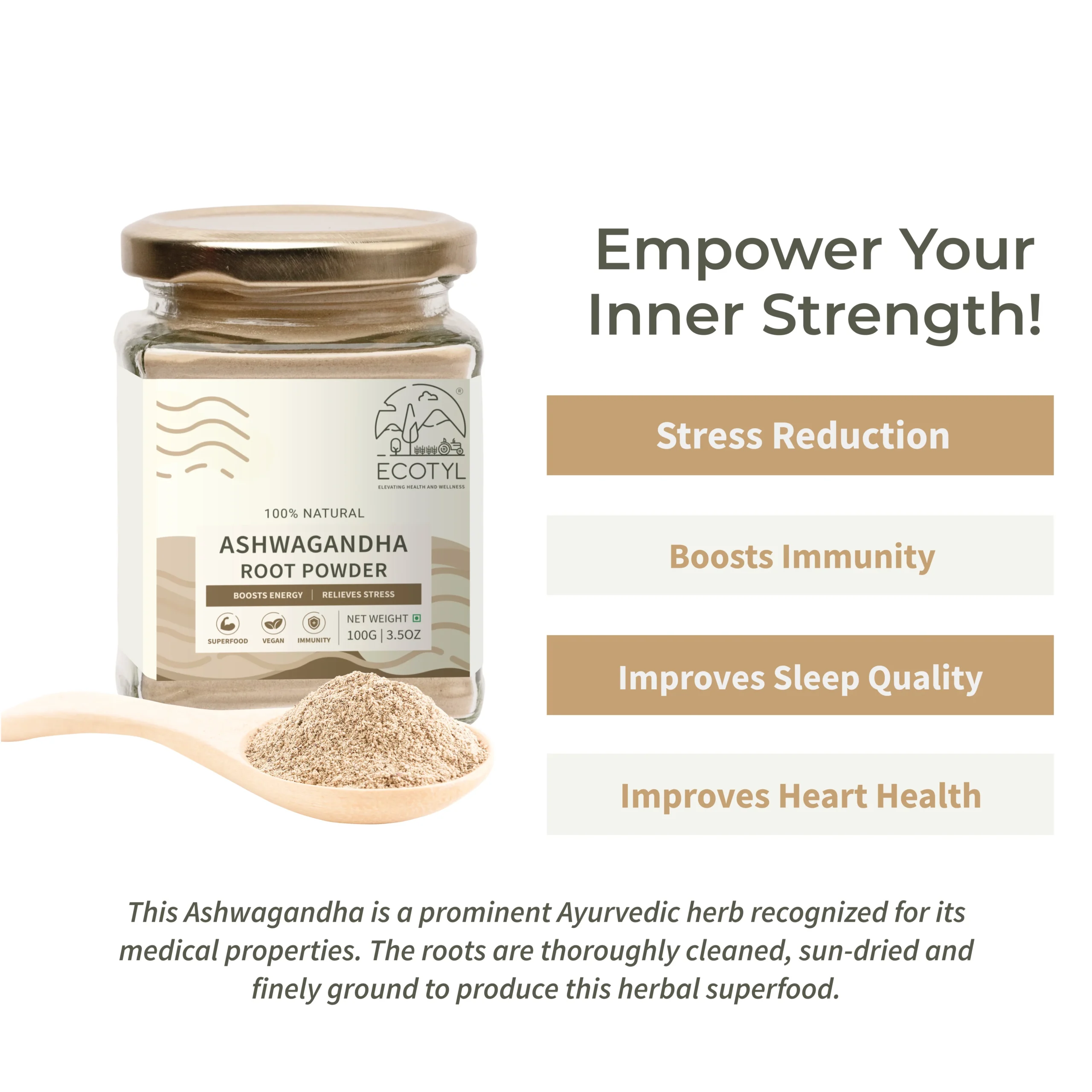 - Adaptogenic Herbal Support: Traditional Ayurvedic ashwagandha root powder to help the body adapt to stress and promote calmness and balance.