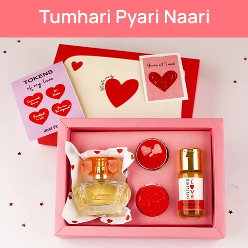 - This Women’s Day Gift Set includes: Relaxing Body Massage Oil: Help her unwind and de-stress with this luxurious massage oil, leaving her skin feeling soft and rejuvenated. Strong & Lasting Mysterious Eau De Parfum: A fragrance to boost her confidence and celebrate her unique self. Calming T-Light Candles: Create a peaceful ambiance for self-care and reflection with these soothing candles. Gentle Soap: A fragrant and luxurious soap to cleanse and nourish her skin, leaving it feeling refreshed and revitalized.