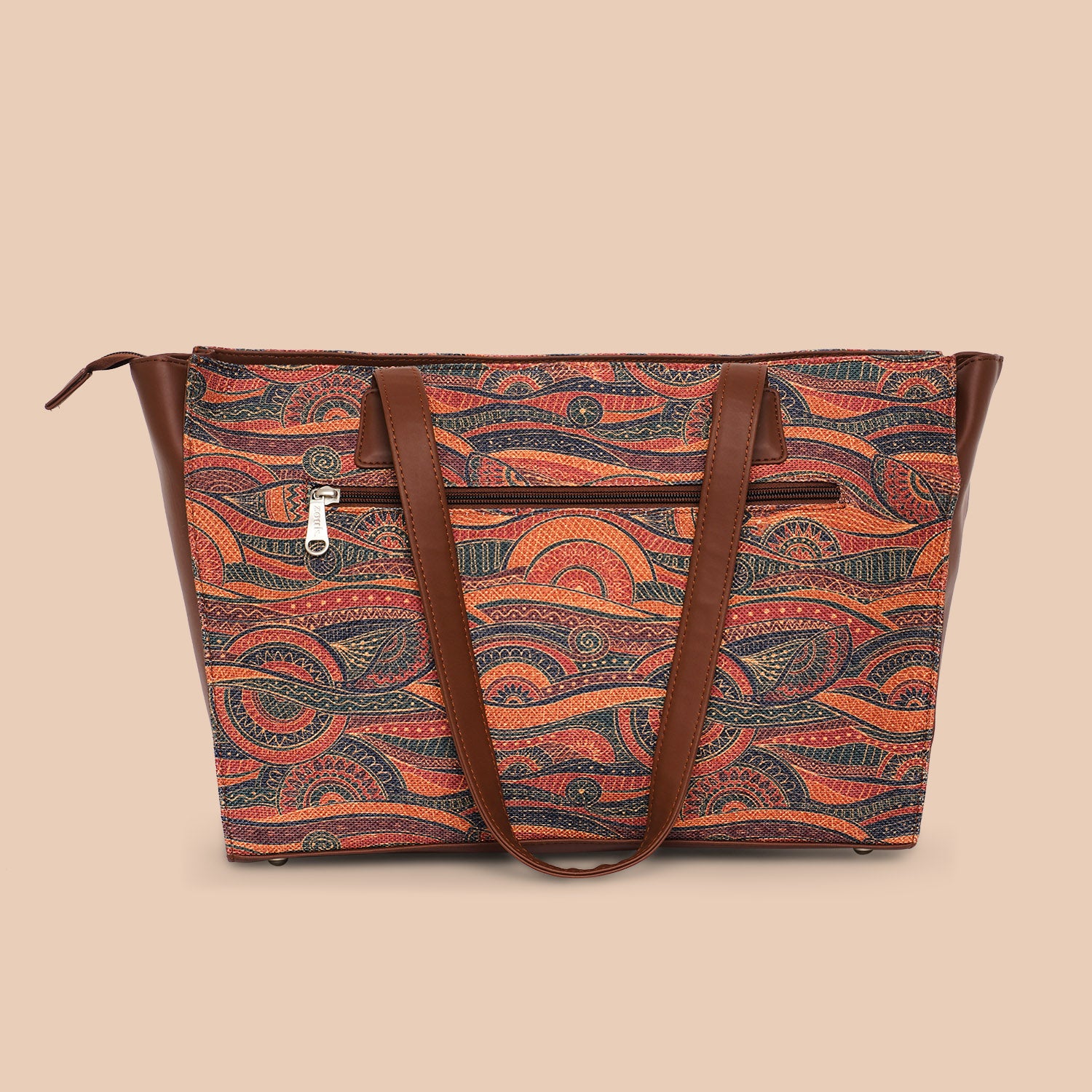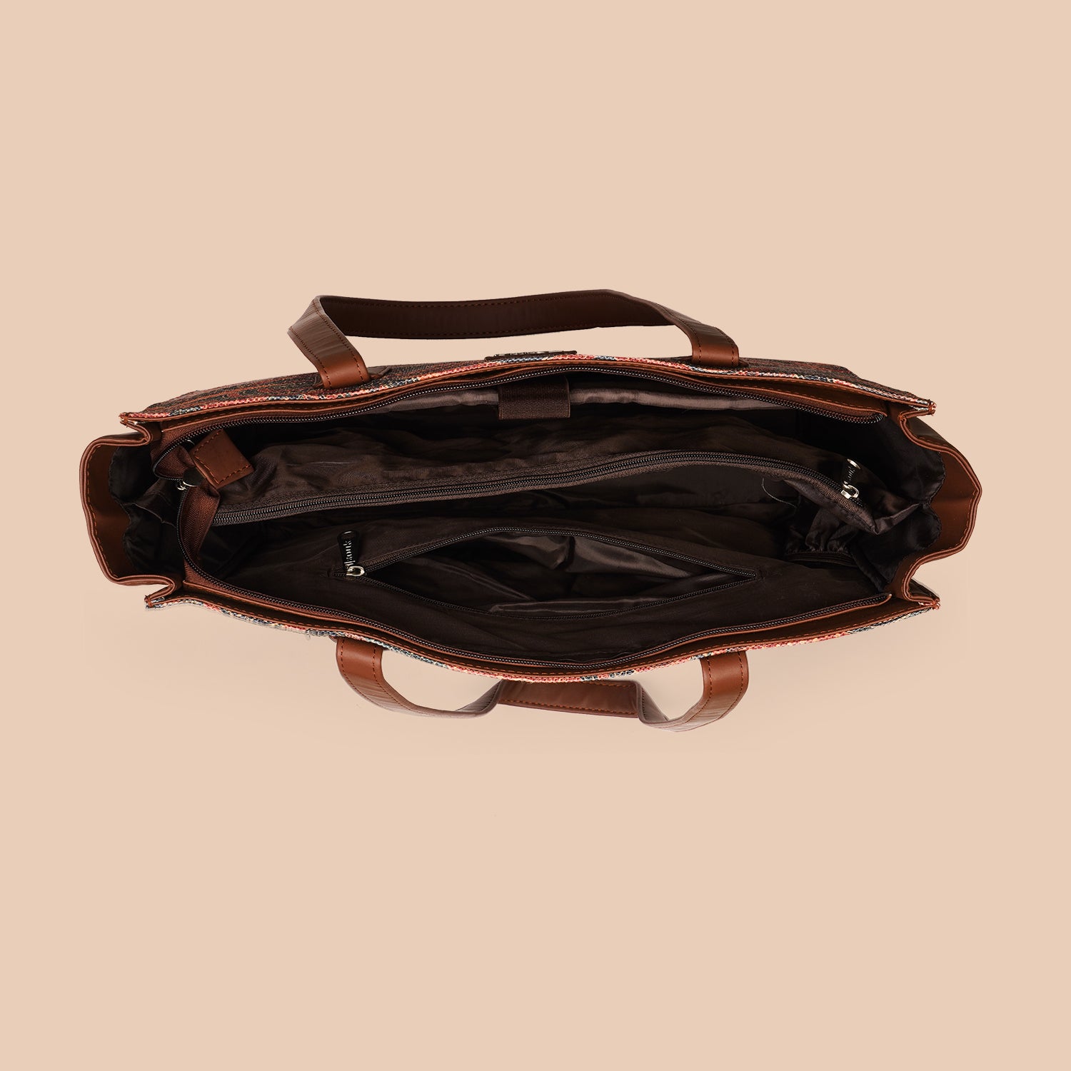 Material Used – Vegan Leather, Handicraft Fabric, Water-resistant inner lining, matte metal fittings.