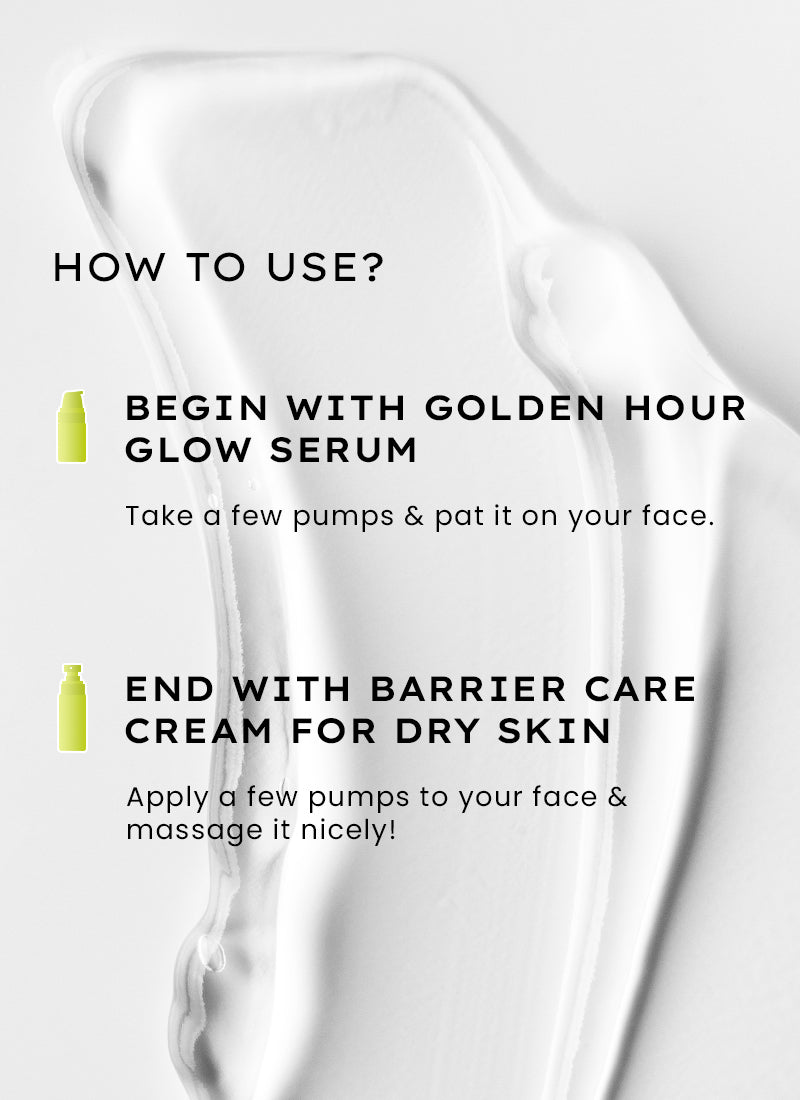 GLOW – MOISTURIZEGLOW UP:Start your before-bed skincare ritual with this hydrating Golden Hour Glow Serum for glowing skin in just 2 weeks with skin-brightening ingredients.MOISTURIZE:Next, apply this lightweight moisturizer – Barrier Care Cream, much-needed for dry skin which nourishes, heals dry skin and repairs its outermost layer, skin barrier.