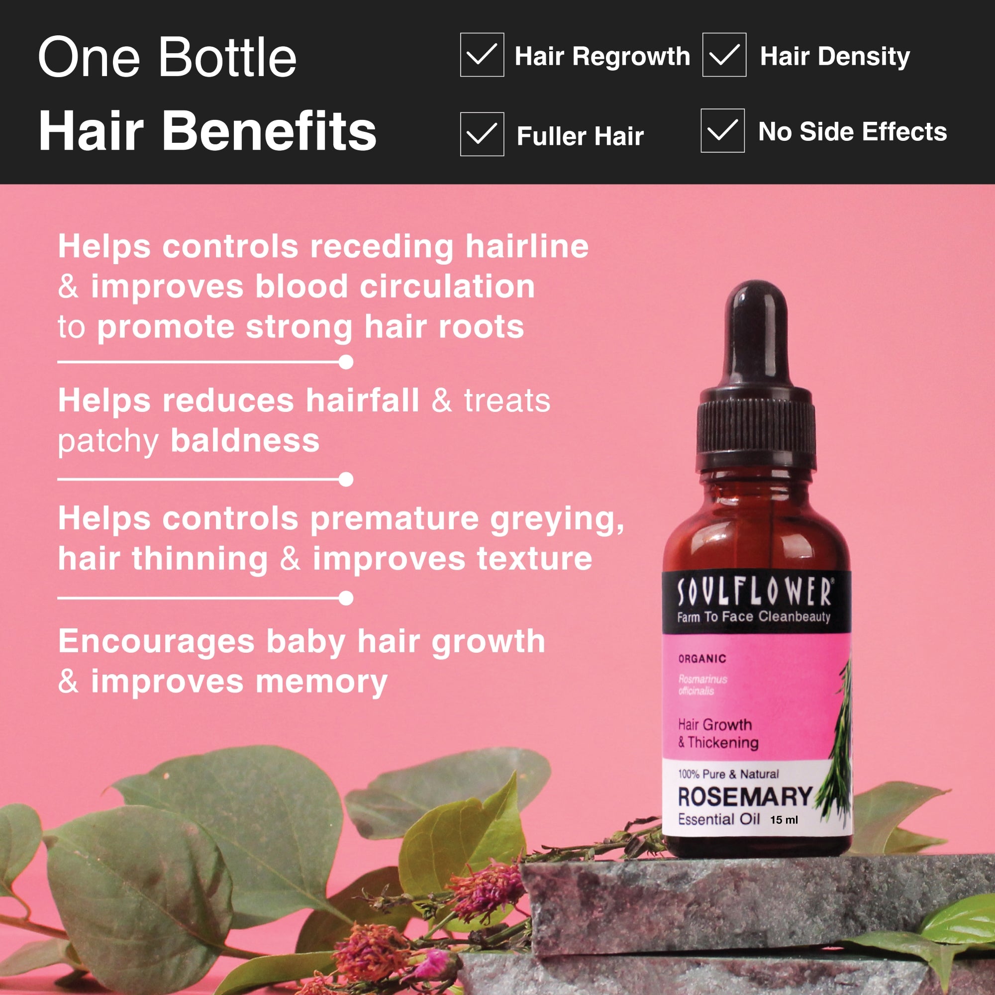 strengthens hair roots, promotes healthy scalp. - This pure Rosemary oil works on all hair & scalp types, targets root causes of thinning & hair fall, receding hairline, premature greying & balding.