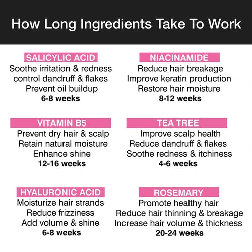 Salicylic acid exfoliates the scalp, treats dandruff and flaky scalp conditions, clears clogged pores, Sebum Regulation along with Hyaluronic Acid to hydrate the scalp and hair follicles, retains moisture, reduces dryness.