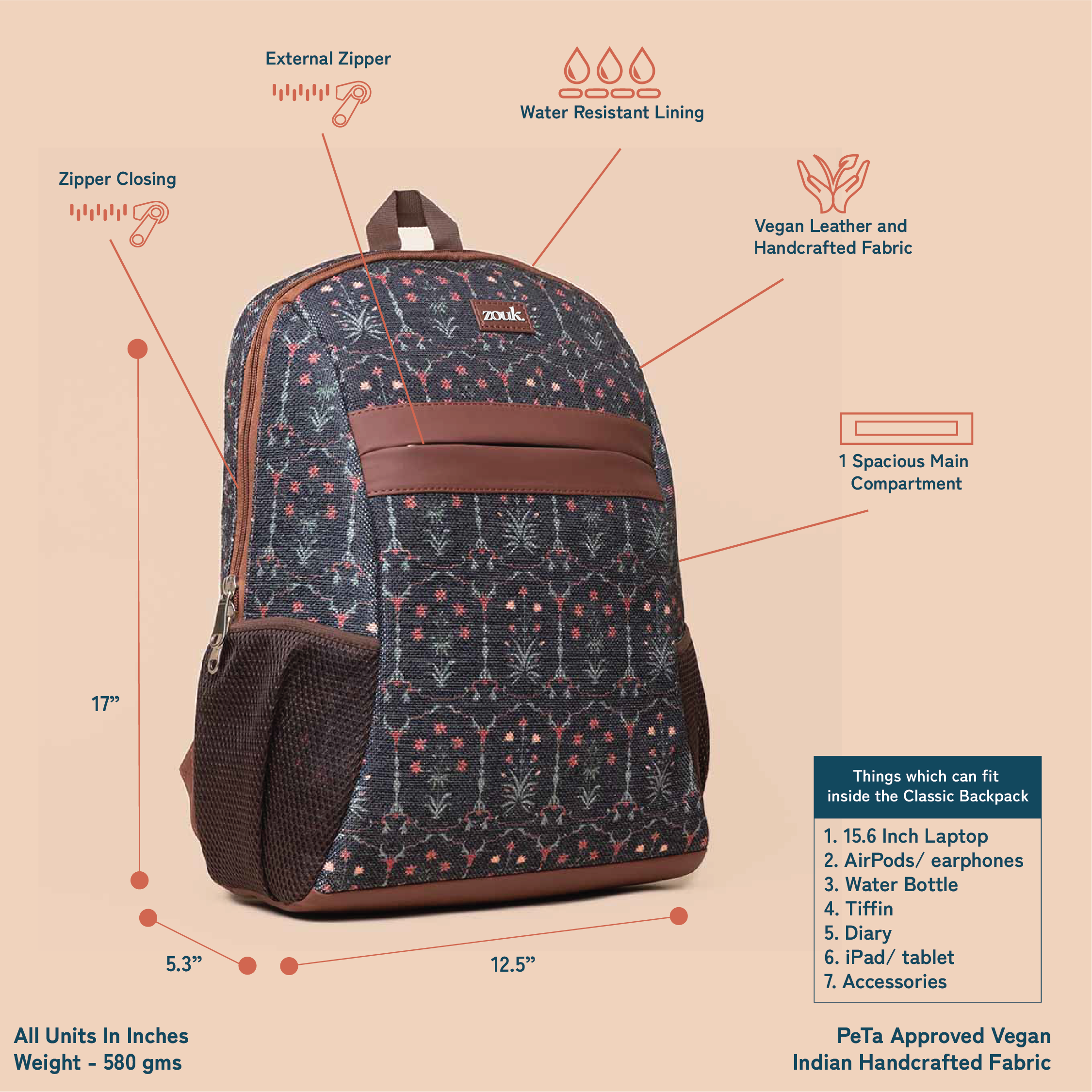 This is a Proudly Indian and 100% PETA approved Vegan Classic Laptop Backpack. It combines modern design with practical features. It has one main spacious zipper compartment which comprises an inbuilt padded laptop sleeve which can fit upto 15.6 inches laptop . It also has an inside zipper pocket to keep small belongings safe & handy. The backpack comes with a trolley strap at the back , this allows your trolley handle to pass through the strap with ease, giving you the accessibility to stroll with backpack & luggage in hand. It also has an easy access external zipper pocket & 2 water bottle compartments. The straps are adjustable with extra padding for comfort to make carrying easier.