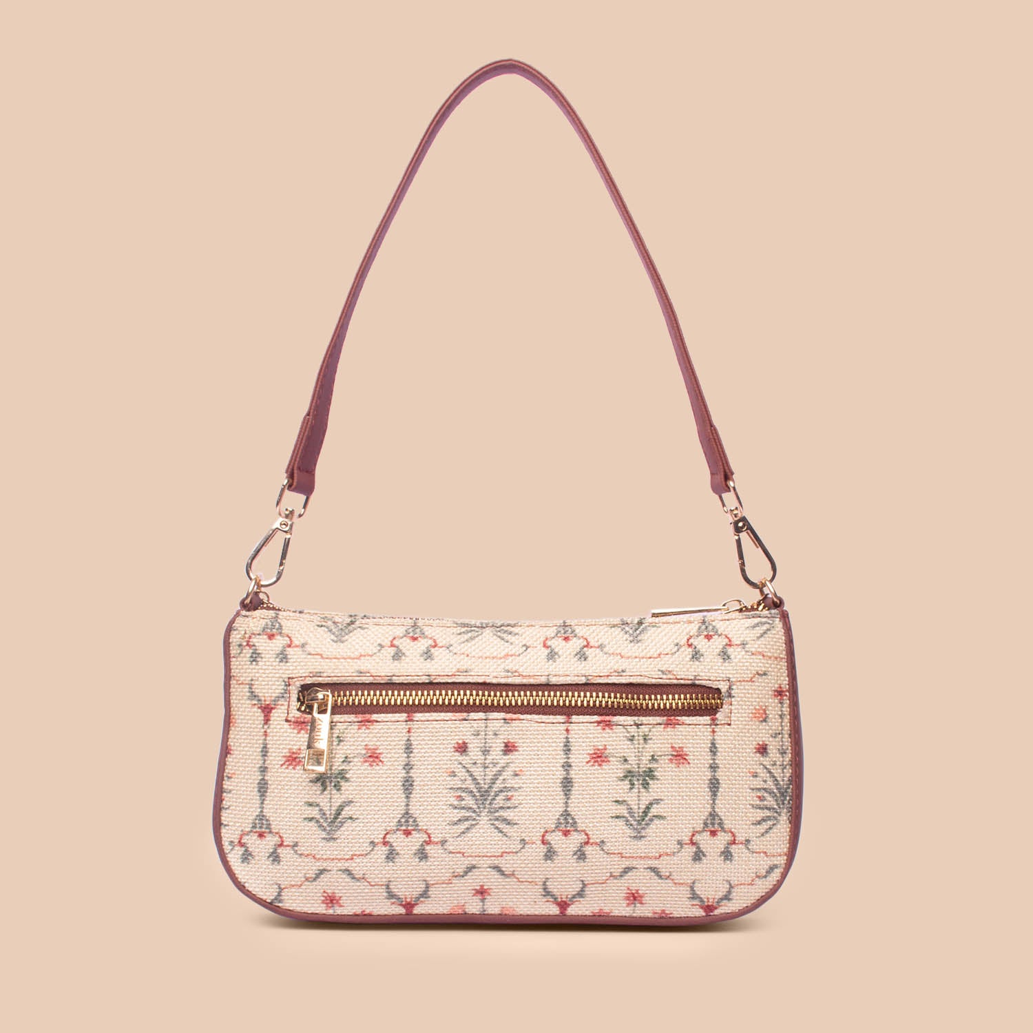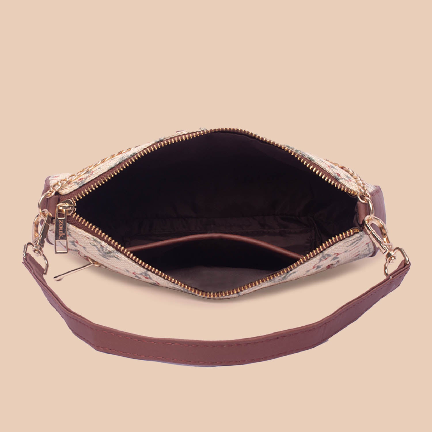 It has a main compartment with a zipper closure. One can comfortably store their essentials like make-up, wallet, phone, keys, and more. It has a slip pocket on the inside to keep your small belongings safe and handy and a back zip pocket for quick access.