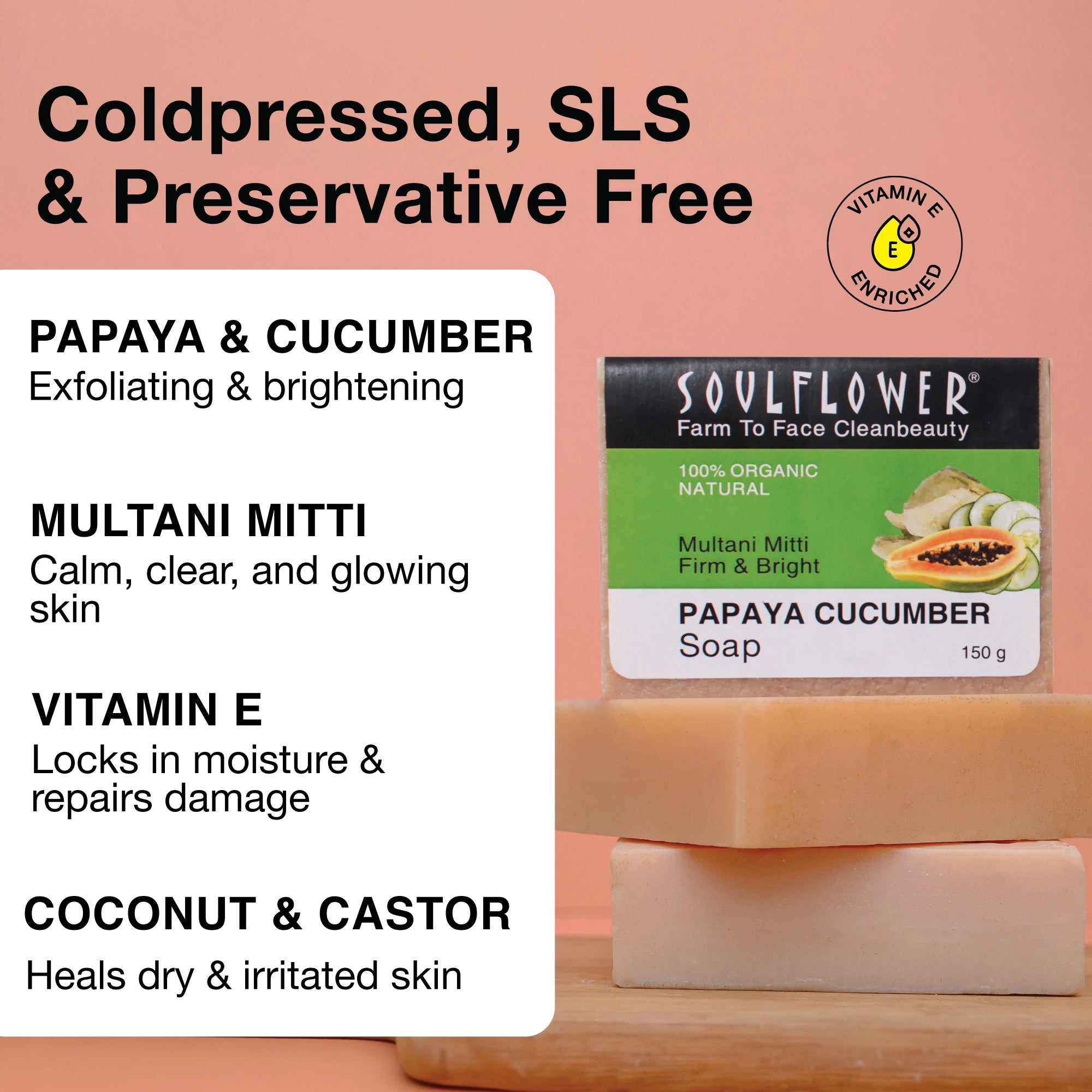 Papaya Cucumber Soap: Palm Oil, Coconut Oil, Palm Kernel Oil, Sodium Hydroxide, Castor Oil, Cucumber Extract, Papaya Extract, Olive Oil, Aloevera Extract, Coconut Milk, Multani Mitti, Titanium Dioxide, Vitamin E, Cucumber Oil