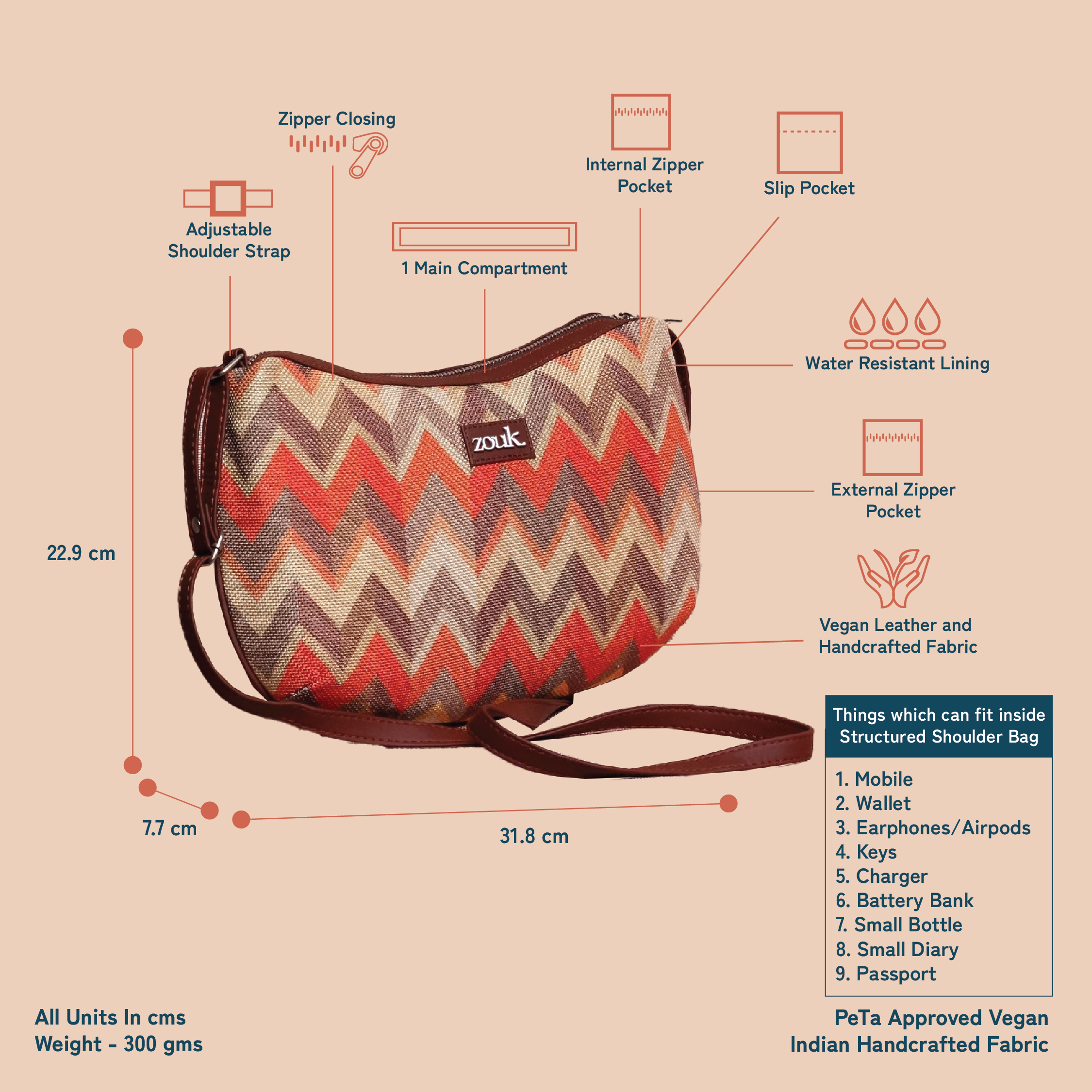 This is a Proudly Indian and 100% PeTA approved Vegan product crafted with Stylish Abstract Pattern. It has sturdy and durable accessories and a single shoulder strap (adjustable) that lends it a good finish. This is a well compartmentalized bag containing a single main compartment with Zip closure. It also has an additional zipper compartment inside the bag & a built-in zipper slot on one side, and pockets on the other side, making it easy to segregate items. The bag comes with a back-chain for quick access to go-to-things.