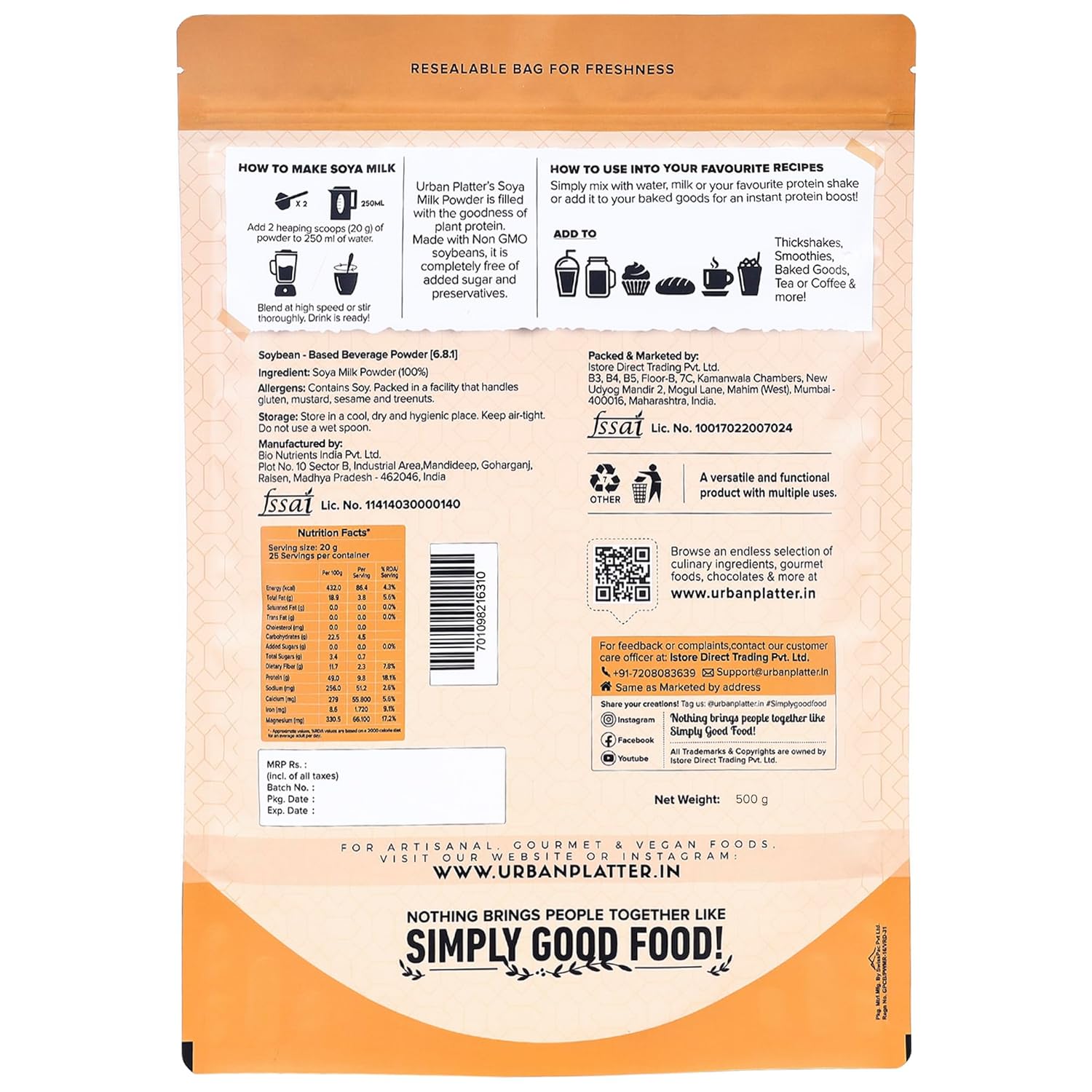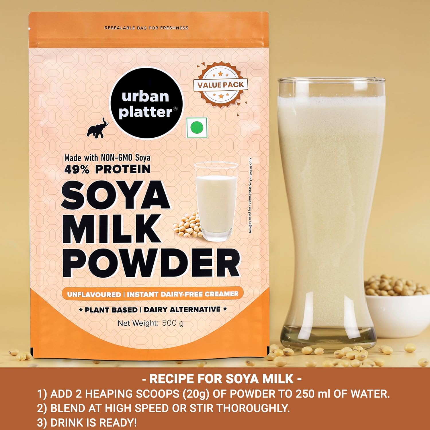 Urban Platter Plant-Based Vegan Milk Powder is a convenient and nutritious dairy alternative designed for modern plant-based living. Made from non-GMO soybeans, this milk powder delivers a creamy and natural beverage when mixed with water while remaining completely lactose-free and vegan.