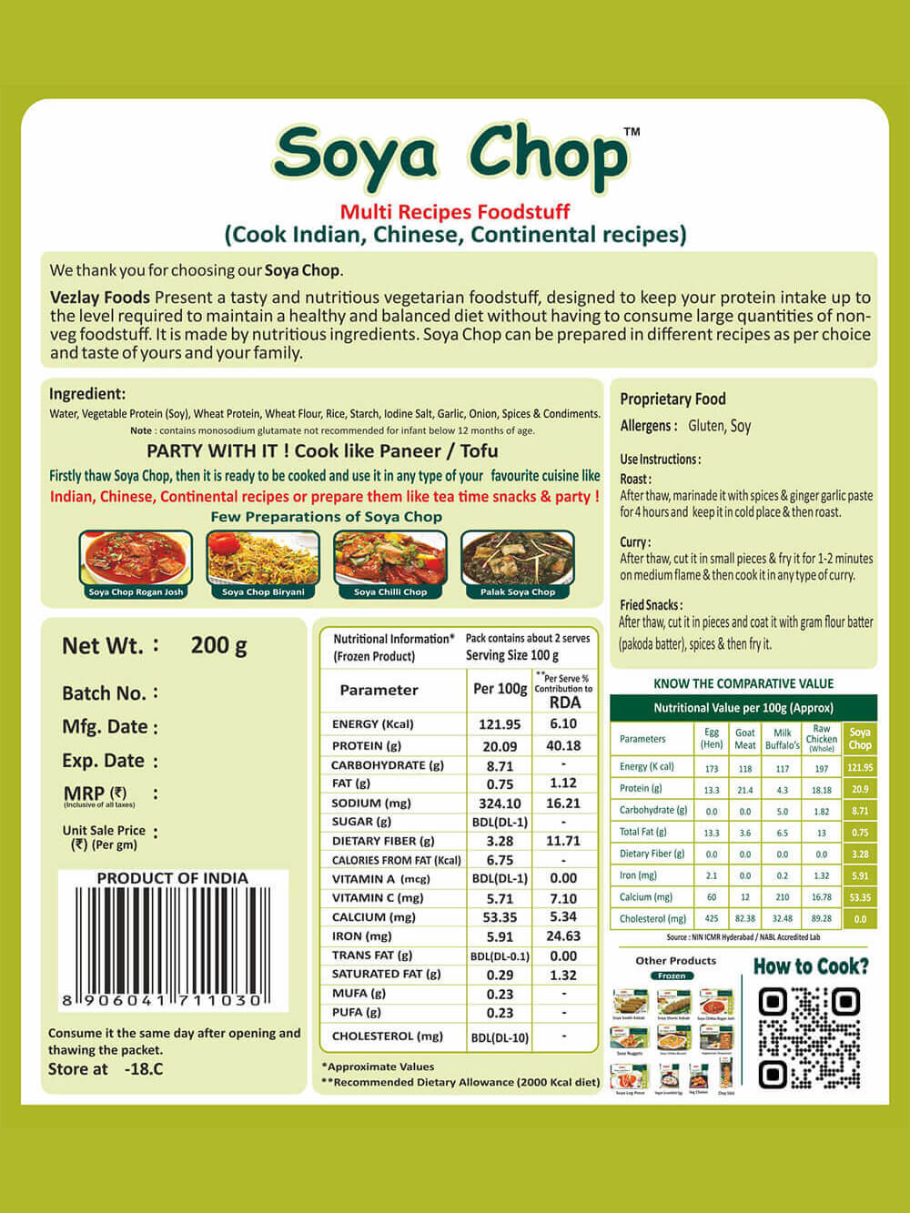 Vezlay Foods presents a tasty and high-protein nutritious foodstuff. Designed to keep your protein intake up to the level required to maintain a healthy and balanced diet without having to consume large quantities of non-veg foodstuff. Made from soy & natural ingredients, Soya Chaap can be used in Indian Chinese, and continental foodstuffs. After marinating, you can grill and fry it a little. As mentioned above it can hence be prepared in the different recipes as per choice and taste of your and your family. Vezlay Soya Chaap is a healthy and tasty food product which made with very hygienic way and healthy and tasty product.