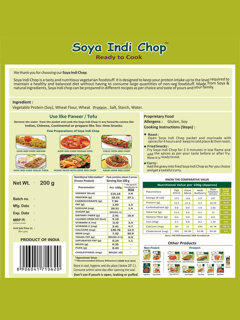 Vezlay Soya Indi Chop is a tasty and nutritious vegetarian foodstuff. It is designed to keep your protein intake up to the level required to maintain a healthy and balanced diet without having to consume large quantities of non-veg foodstuff. Made from soya & natural ingredients, Soya Indi Chop can be prepared in different recipes like Chinese and Indian continental as per the choice and taste of yours and your family.